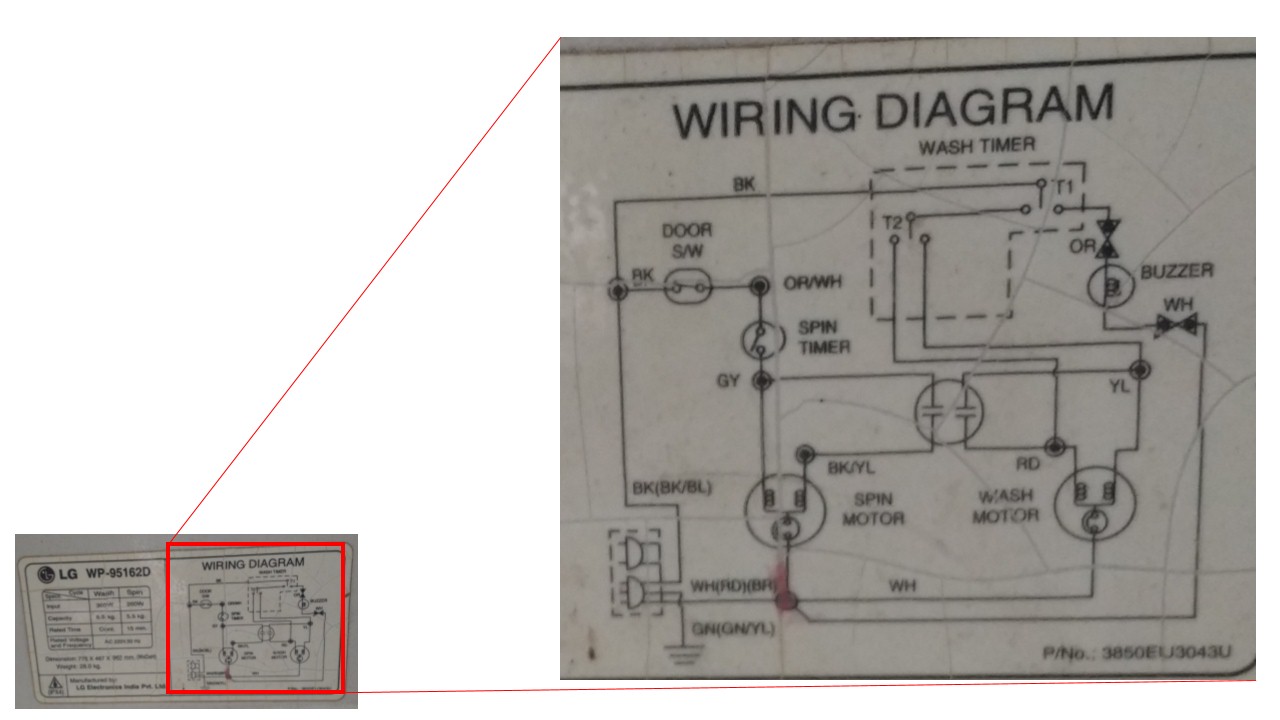 Below is an internal picture of a normal 6 kg washing machine. The motor which rotates and cleans the clothes has three wires. What we are seeing is that of red (RD), yellow (YL) and white (WH) color. A wire (WH) is connected directly to a wire of electricity and the remaining 2 strings are joined by the timer (once red then once yellow) by the regulator to the other electric wire.