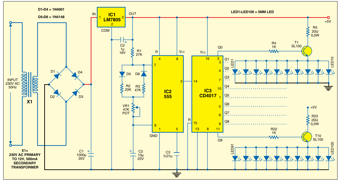 The speed can be reduced or increased from VR1. After the tenth transistor, the first transistor turns ON again and this cycle continues. To get more attraction, each series can have different color LEDs in it.