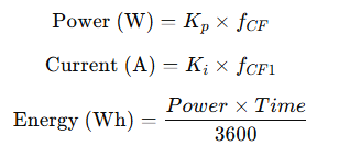 A microcontroller measures the pulse frequency, computes the ratio with calibration constants, and displays the power, current, voltage, and energy on a web dashboard or LCD.