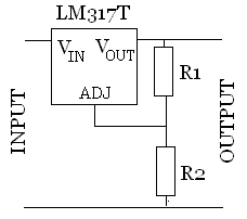 Note: The LM317 output voltage is calculated using: Vout = 1.25 × (1 + R2 / R1). Ignores Iadj for simplicity.